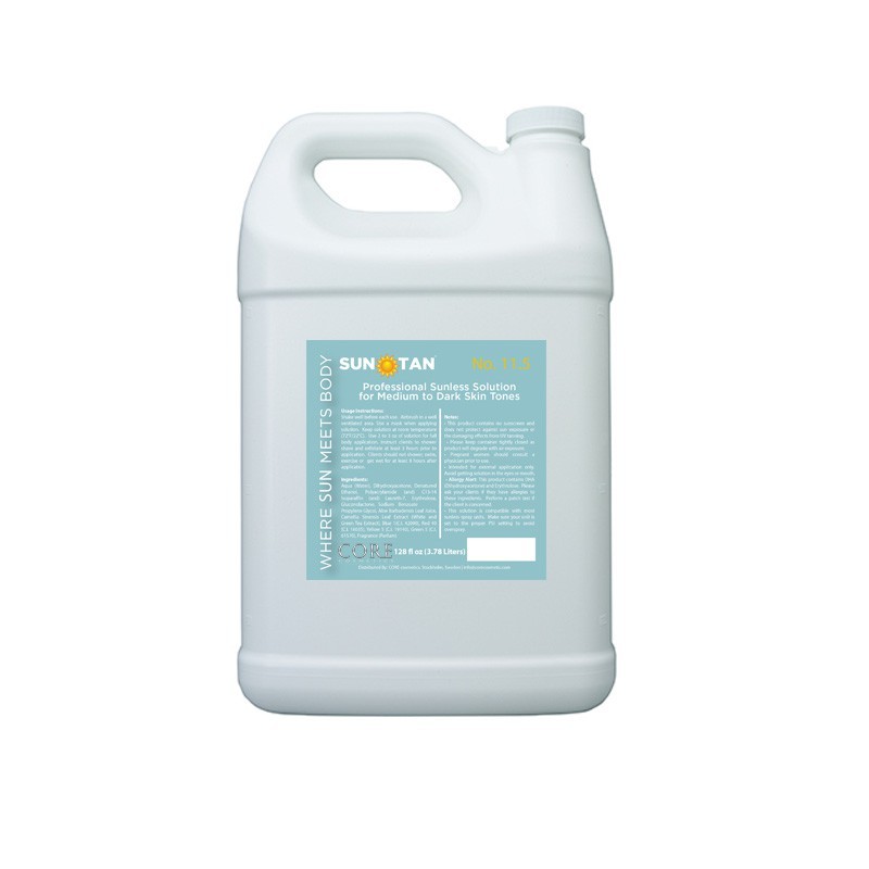 SUN TAN® 11.5 was created with your elite sunless tanning clientele in mind. Perfect for medium to dark skin tones, this spray tan solution produces a deep mocha color that will turn heads. Enriched with vitamins A, C and E, SUN TAN® No. 11.5 leaves the skin feeling smooth and looking fresh.